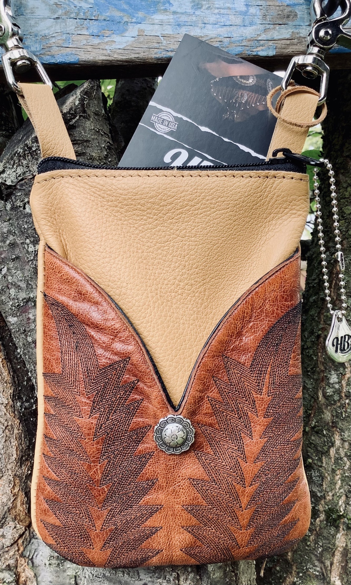 HipBag Cell Phone Tan Vintage Cowhide & Turquoise Brown Aztek